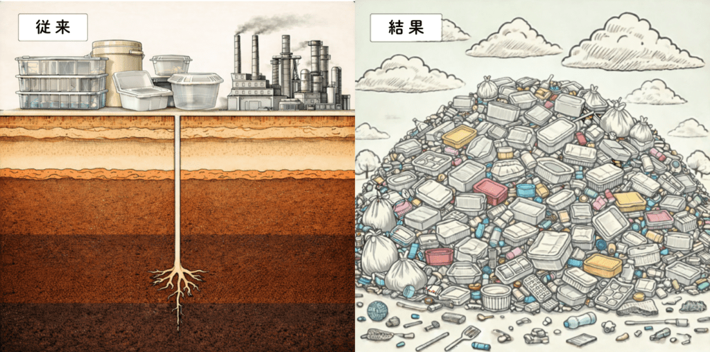 (地下資源でものづくりを進めてきた結果、プラスチックごみが増えていったイメージ)