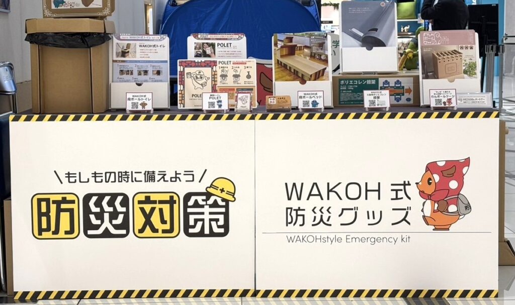 和光紙器では、自社開発の環境配慮型防災グッズを展示し、「段ボールベッド」「段ボールトイレ」携帯トイレ「POLET」「ポリエコレン担架」などをご紹介しました。