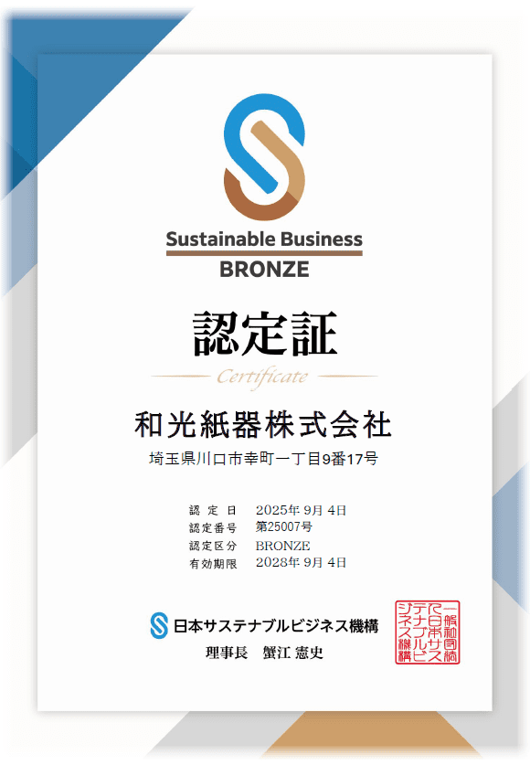 このたび、和光紙器株式会社は一般社団法人日本サステナブルビジネス機構(JSBO)が実施する【日本サステナブルビジネス認定制度】において、BRONZE認定をいただきました。
