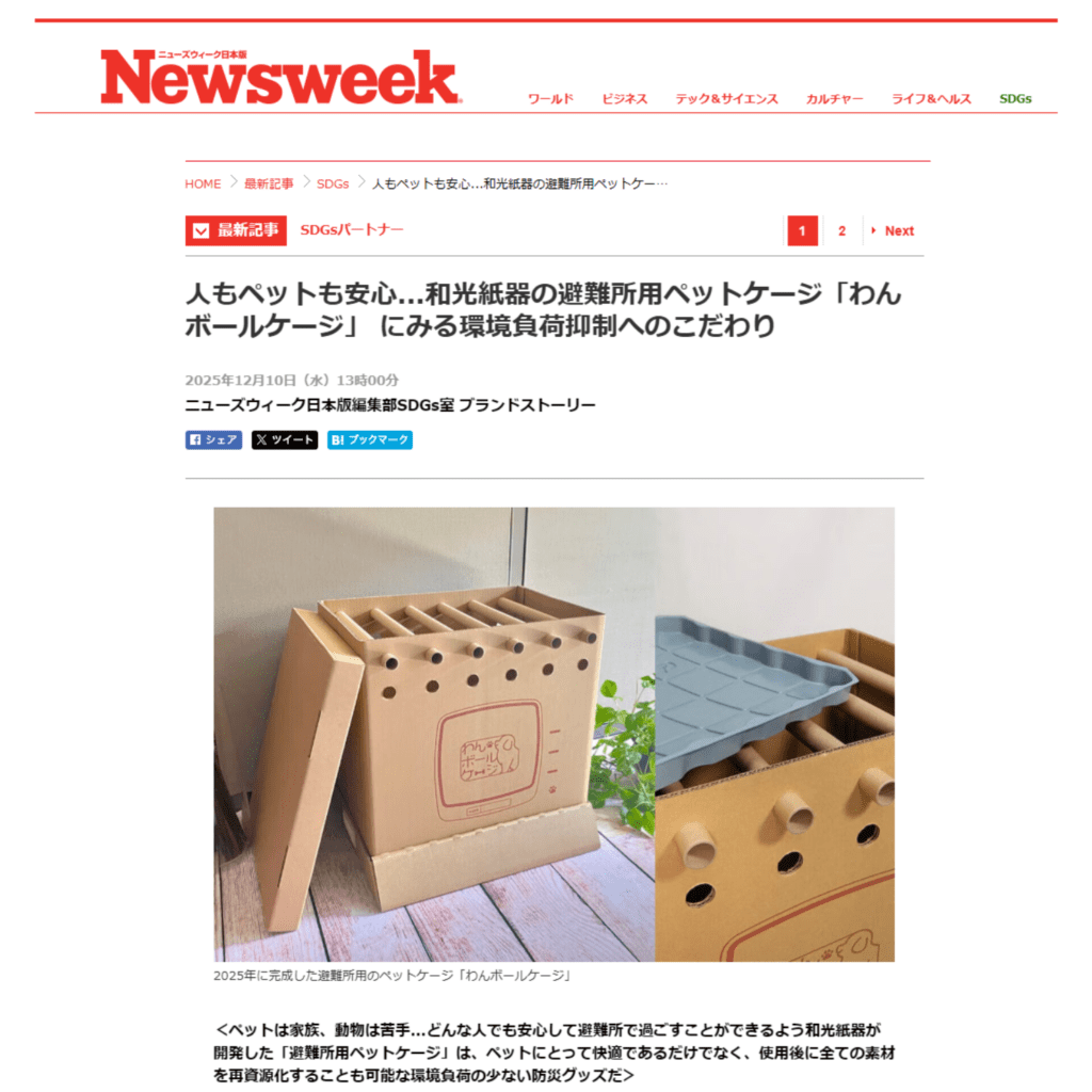 このたび、ニューズウィーク日本版のSDGs特集にて、和光紙器の防災プロダクト「わんボールケージ」にみる環境負荷抑制へのこだわりが紹介されました。