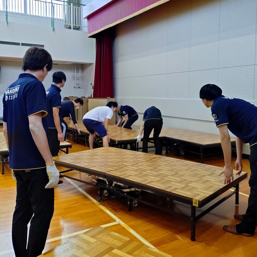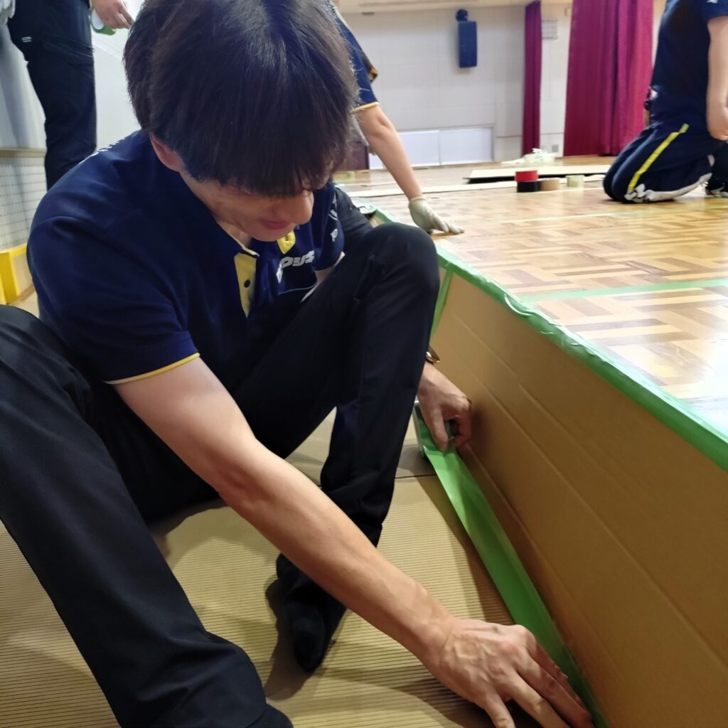 「今年で3回目のお手伝いとなりました。舞台設置では、つなぎ目をテープで補強したり、スロープを設置したり、段ボールで隙間を埋めるなど、安全面に配慮しながら手際よく作業を進め、無事に舞台を完成させることができました。