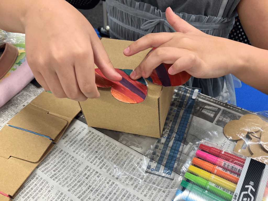 びっくり箱作りではお友達同士で教え合いながら、それぞれ工夫を凝らして楽しそうに取り組んでくれました。特に、難しいバネの部分が完成したときには、喜びと笑顔であふれていました。最後まであきらめずに頑張る姿に、私たちも元気をもらいました。