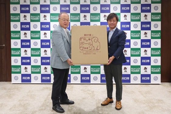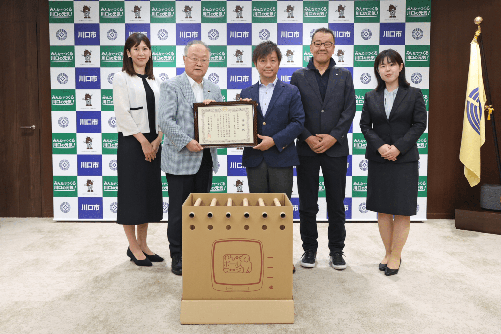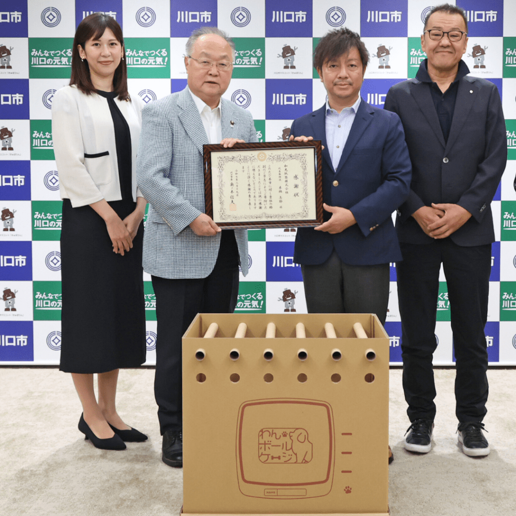 2025年8月19日、川口市役所でペット避難用ケージ「わんボールケージ」の寄贈式が執り行われました。