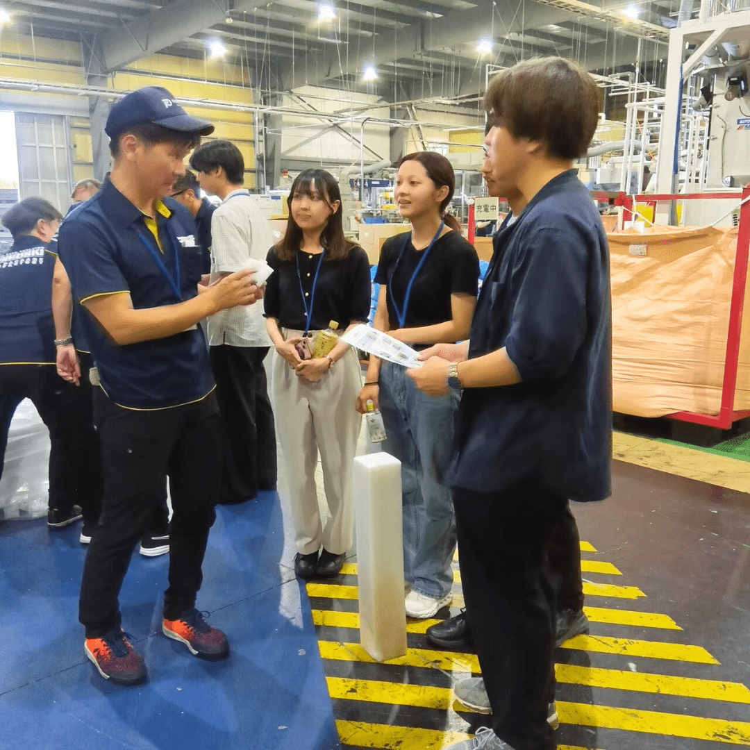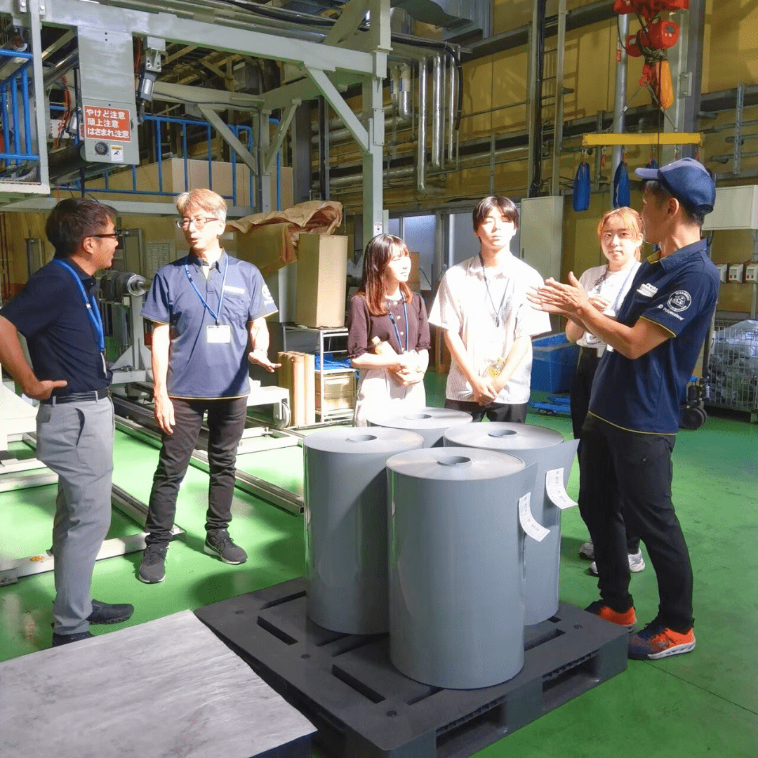 当日は工場見学を通じて、サーキュラーエコノミーが取り組める環境配慮型の輸送トレー「ポリエコレンシリーズ」や当社の持続可能な社会づくりへの取り組みを紹介しました。